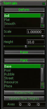 This "pinches" all terrain vertices together, producing a smoothing effect on the terrain. This is usually the last step, and is used to "clean up" and make hills and cliffs look more realistic. Select "Smooth" from the Deform menu (it doesn't matter if you are in Raise mode or not). Left click to smooth. Adjusting the "Scale" slider will change the 'pressure' of the smoothing process. For kicks, you can un-smooth terrain by holding down Lshift + Left-click.