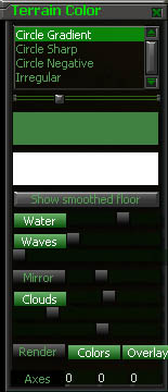Click one of the boxes to change a color. Adjust the sliders to get the desired color, or type the RGB values into the adjacent boxes. Left-click the terrain to paint the terrain verts that color.