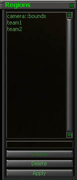 To create a region, define the area that will be the region by Lclick+drag on the terrain. Type a name in the small box above the 'create' button. Click "create". Your new region should now appear on the list. To delete a region, select it from the list and click "delete".