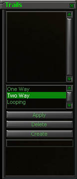 All trails must be set to a team. First, highlight the team in the Teams menu that the trail will belong to. Select "One Way", "Two Way" or "Looping". Left click the terrain to begin laying the trail points. Right click to erase trail points. When your trail is finished, type a name for it in the rectangular text box. Then click "Create".