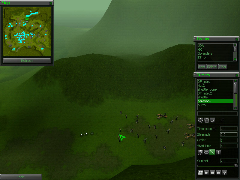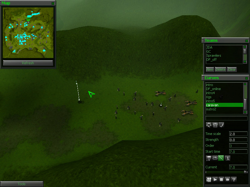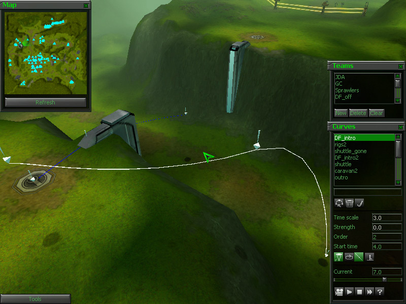 Jump over to the path called "rigs2". It is located in the southeast corner of the map. Again, this is a fairly simple curve that introduces the 3 rigs that the player is being given. The only new feature is the blend from camera path to playable in-game view. You will notice in the game that at the end of the path, the letterboxing will disappear and the interface will pop-up, giving the player control of the view. This is done at the start of most missions. It looks great and it draws the player into what's going on. Most of this is done in the scripting section that we will cover next, but it is important to end the curve at a point that will blend smoothly with the default F3 view.