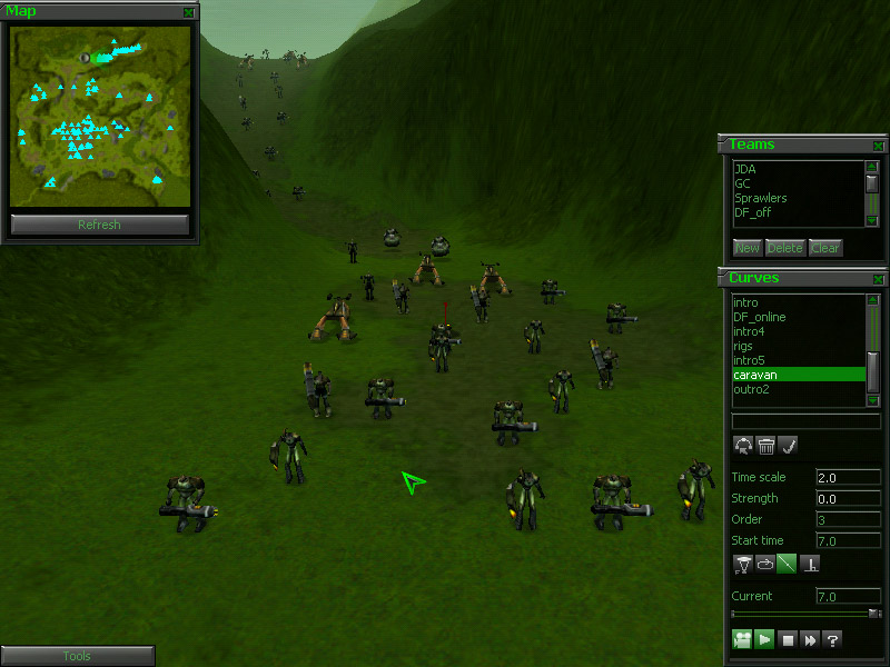 Click on the camera in the bottom left corner of the camera tool, then click the play button next to it. You should see a 7 second movie that starts low to the ground, then pans up over the Sprawler units. You'll notice that none of the units are moving like they are in the mission. We'll get to that.